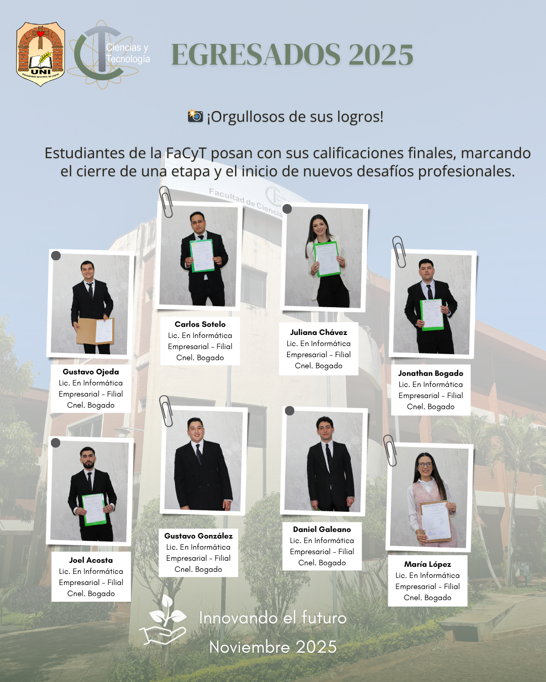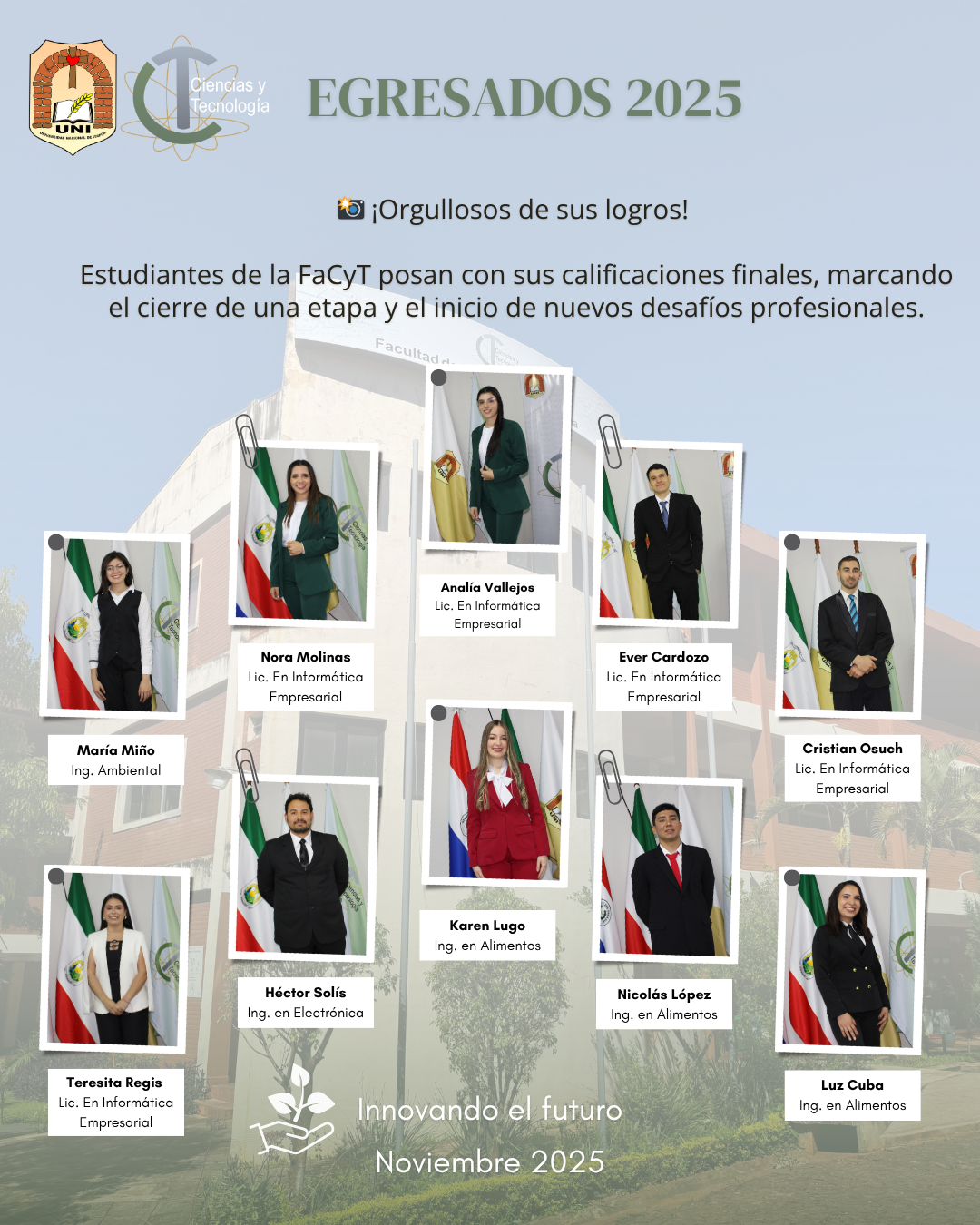 Del martes 14 al jueves 16 de octubre del año en curso, 2025, se desarrollaron las Exposiciones Orales y Defensas de los Trabajos Finales de Grado de la Facultad de Ciencias y Tecnología de la Universidad Nacional de Itapúa, correspondiente a la última convocatoria del año.