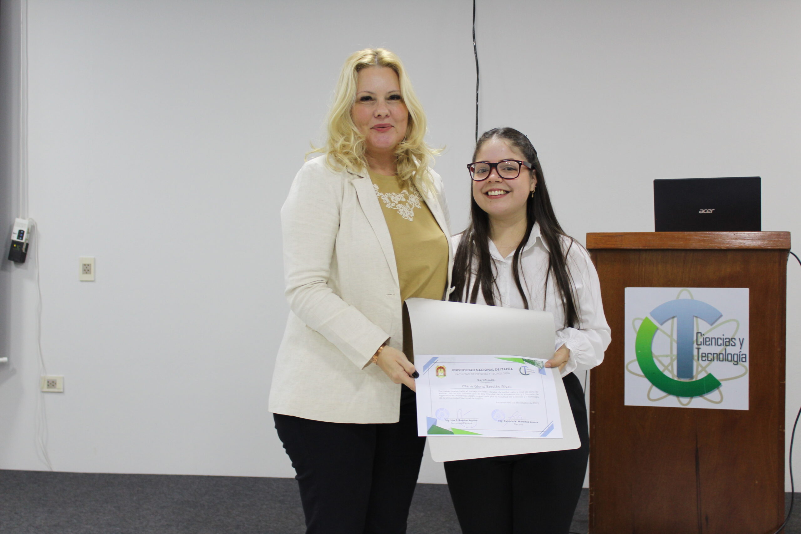 - Mg. Natalia Rolón docente e investigadora de la FaCyT-UNI, quien presentó los resultados parciales de la investigación sobre el «Aprovechamiento de residuos de yerba mate y otros sustratos para optimizar el cultivo de hongos comestibles».
