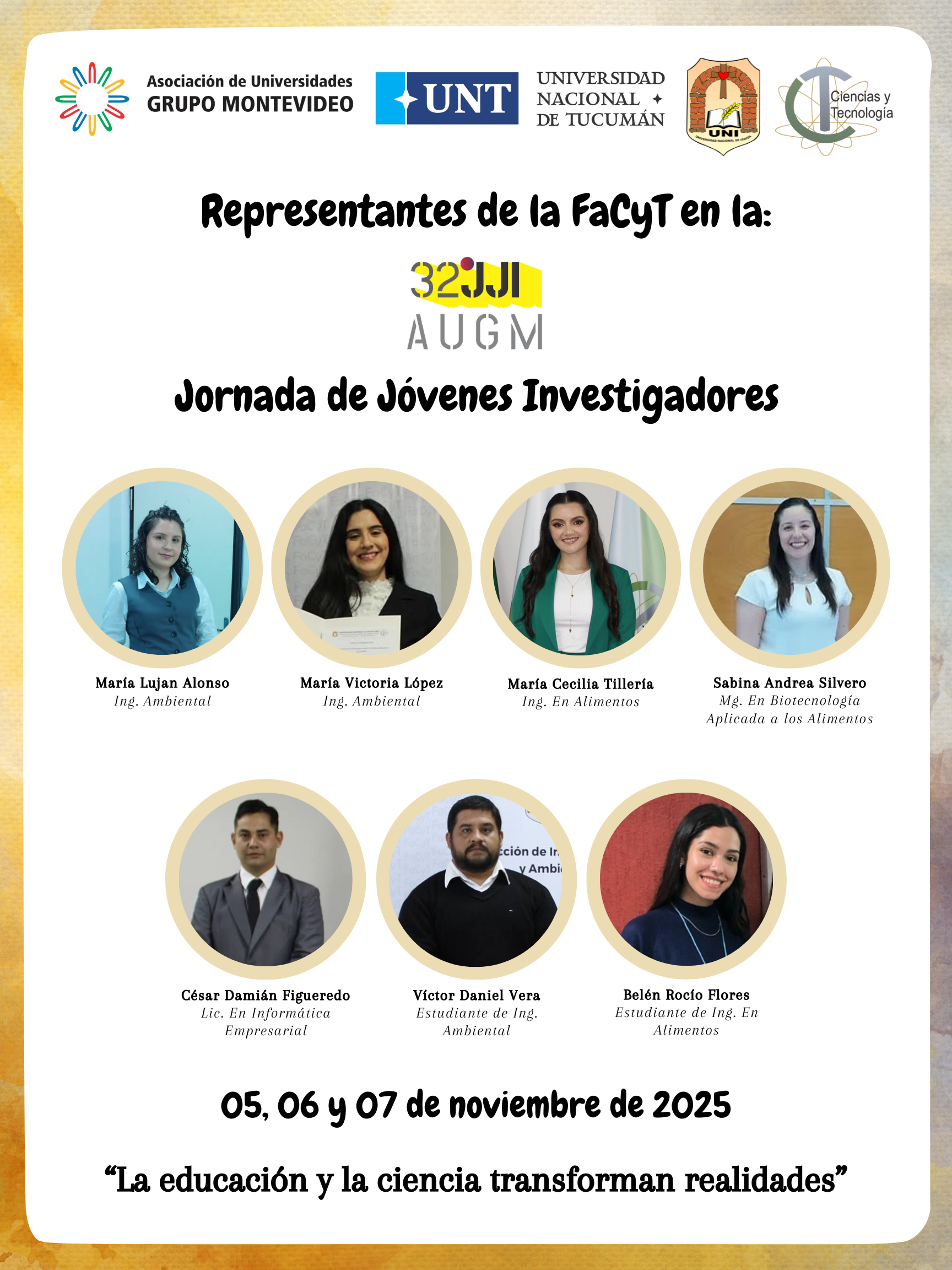La Facultad de Ciencias y Tecnología de la Universidad Nacional de Itapúa se enorgullece en presentar a sus representantes en la 32a Edición de las Jornadas de Jóvenes Investigadores de la Asociación de Universidades Grupo Montevideo (AUGM), que se llevará a cabo los días 5, 6 y 7 de noviembre de 2025, en la Universidad Nacional de Tucumán, Argentina.