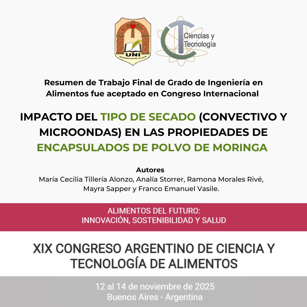 El estudio titulado “Impacto del tipo de secado (convectivo y microondas) en las propiedades de encapsulados de polvo de moringa”, fue desarrollado por María Cecilia Tillería Alonzo y Analía Carolina Storrer, con el acompañamiento de la Ing. Ramona Morales Rivé, la Dra. Mayra Sapper y la orientación del Dr. Franco Emanuel Vasile.
