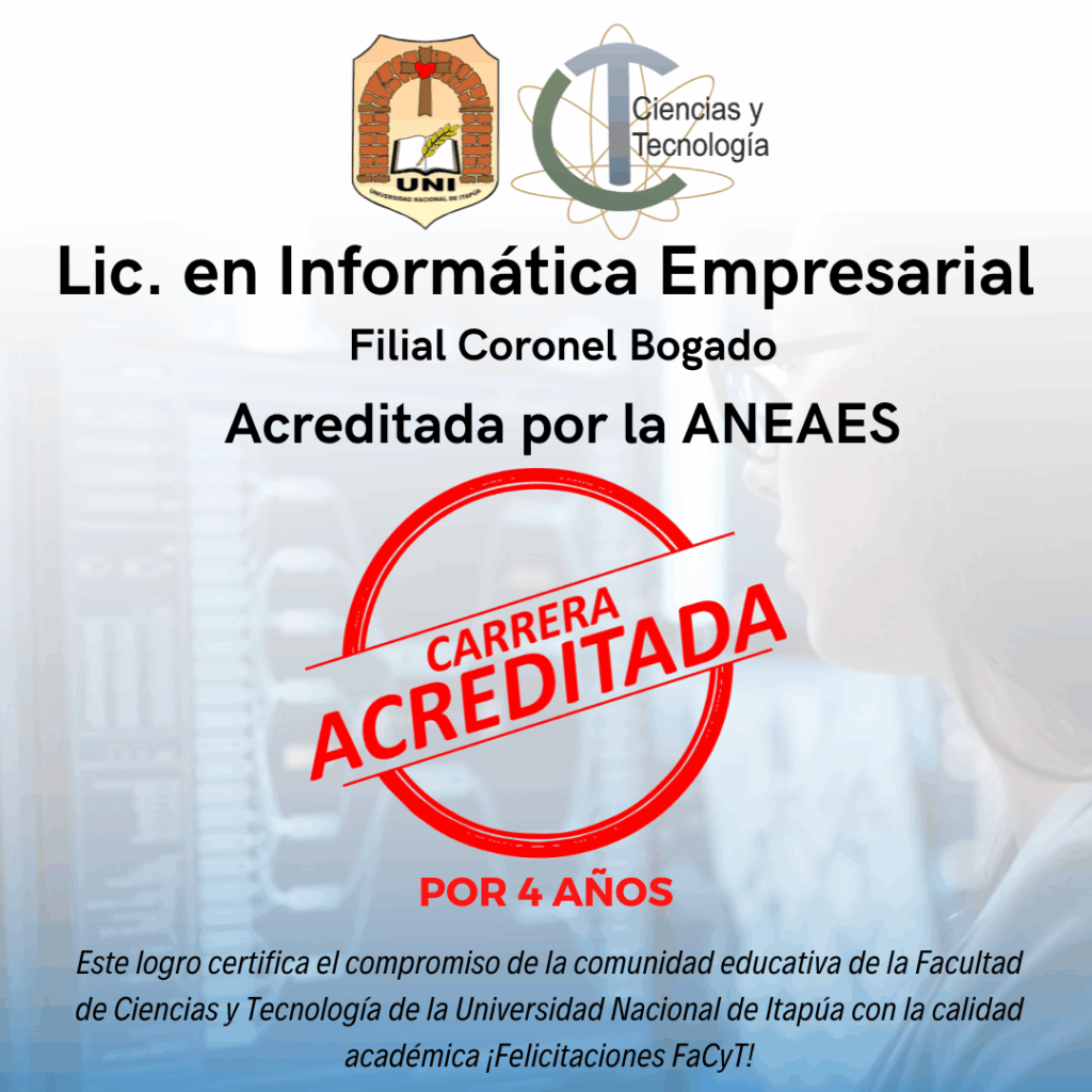 📍 La carrera de Licenciatura en Informática Empresarial – Filial Coronel Bogado, por 4 años, ambas por la Agencia Nacional de Evaluación y Acreditación de la Educación Superior (ANEAES).