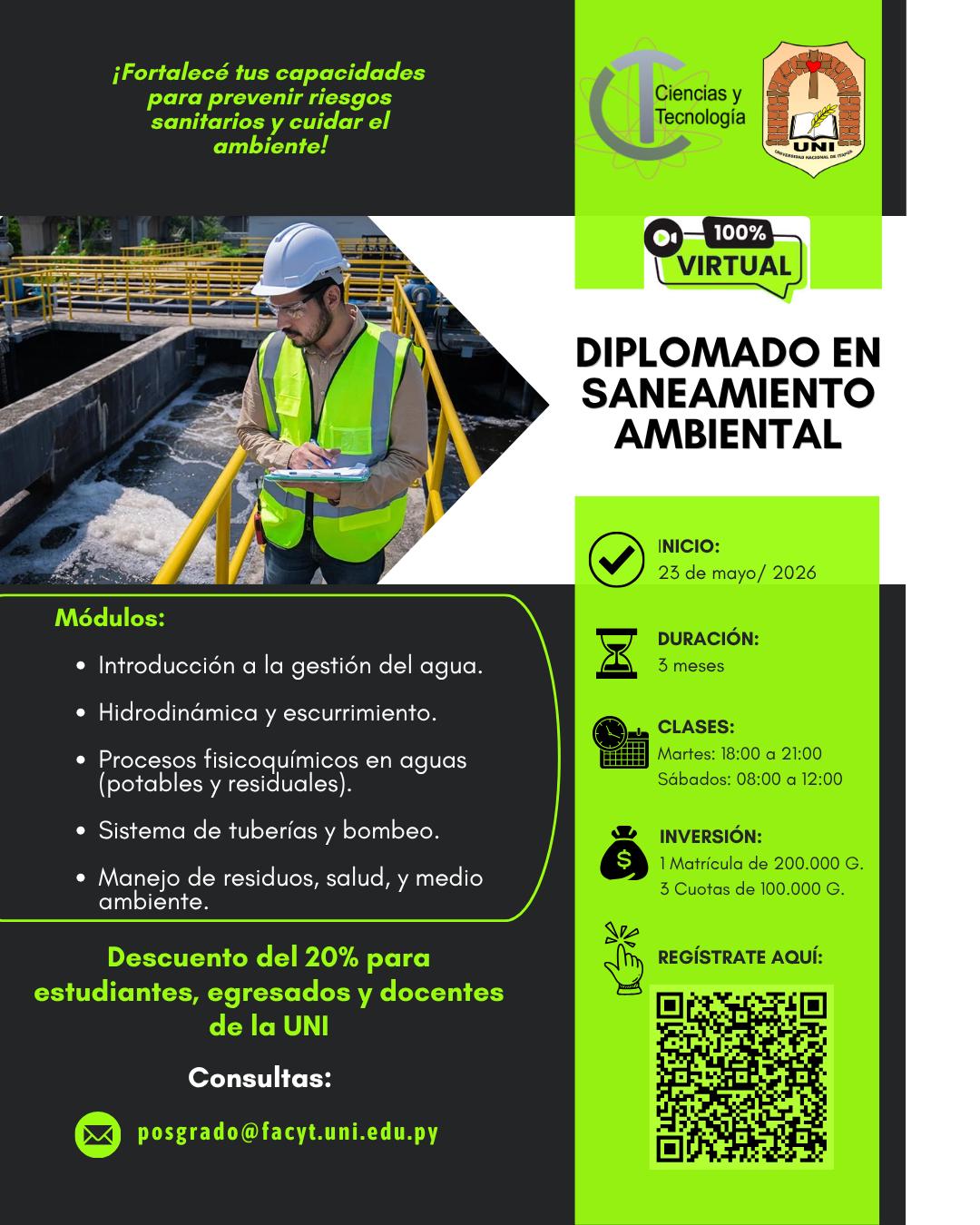 La Facultad de Ciencias y Tecnología de la Universidad Nacional de Itapúa invita a participar del Diplomado en Saneamiento Ambiental. El curso se encuentra dirigido a profesionales vinculados a las áreas: ambiental, civil, química, sanitaria, producción de alimentos, industrial, y afines; y tiene como objetivo formar profesionales competentes en la gestión integral de recursos hídricos y el tratamiento de aguas residuales, capacitándolos para implementar prácticas sostenibles y tecnologías innovadoras que contribuyan al bienestar de la comunidad, la protección del medio ambiente y la salud pública, preparando a los participantes para enfrentar los desafíos actuales y futuros en el ámbito del saneamiento en Paraguay.